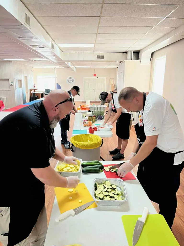 Employees of Comcast Midwest Region assisted with the preparing and serving of the free meal to VFW members and their families. Local community members also gathered to enjoy the meal and celebrate fellowship, the outdoors, and the spirit of giving back to those who have served in a new network expansion area.