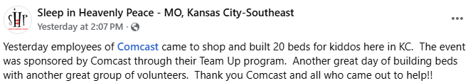 Comcast also took part in the Harrisonville Log Cabin Festival, which included a parade, carnival, and entertainment, and employees built 20 beds as part of a charity event in partnership with Sleep in Heavenly Peace, a non-profit dedicated to building and delivering beds to area children in need.
